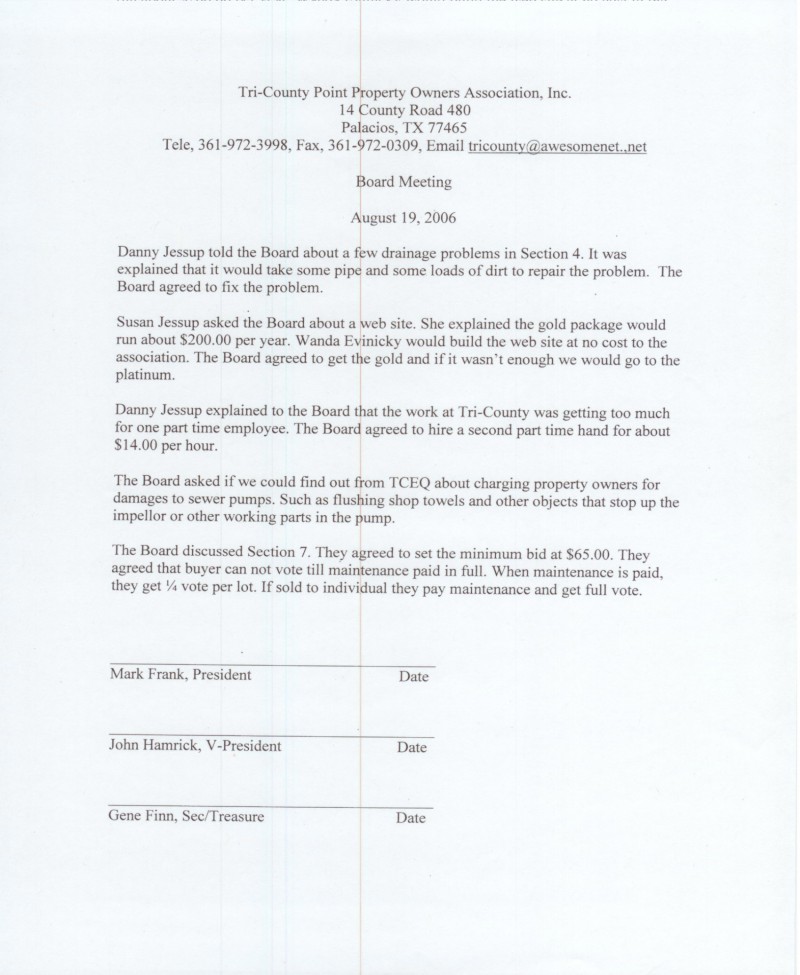 The board met in executive session for a budgetary and operations discussion. President Stanley Kazwell, Vice-president Karen Jacobs, and Secretary/Treasurer Dale Porter met with Sonya Brown of Houston based Marshall Management a community and development management company that works homeowners associations. After the executive session the board gave a summary of the meeting. Sonya Brown did a preliminary review the books and confirmed what another professional had told us, the books for the last several years are in total disarray. While a lot of positive work had been done by Becca, a lot more was needed to put them in order. The board has contracted with Mrs. Brown at half of her standard rate, to further assess the books and to act as a consultant and help get the books of the POA in order. The ultimate goal is to set the association on a more professional path of financial and management responsibility. In the coming weeks she will continue her review, work with Becca and report back to the board. Mrs. Brown also agreed to defer her compensation for a few months until the POA can more easily handle it. In September, with the benefit of Sonya Browns report, the board will work on, and establish a budget for the coming year. The board also agreed to direct Becca to immediately send out collection letters for all accounts in the arrears for 2013 & 2014, and to automatically do the same each and every March 1st of each year. This action shall include many people who had not been billed for their fees in recent years due to being removed from the POAs property owners rolls. While many have been restored to the rolls, many are still missing. The POA office staff has now received a property owners listing from Jackson County and will use this to secure the rest of the property owners information. In an effort to decrease current operational costs, the summer schedule for the office will be as follows: Open Monday, Thursday, and Friday closed Tuesday and Wednesdayuntil further notice. Also, in an effort to bring costs in line, the board has shopped the comprehensive insurance policy carried by the POA which currently costs in excess of $15,000. After consultations and a tour of the community, Dale Porter reported that he believed it was possible to save as much as 50% of this cost. A local insurance professional is set to report back with the goal of have the POA newly insured by July 31. Since he was the only person who sought to qualified for the position of Secretary Treasurer, Dale Porter automatically becomes the elected officer for that position. The board agreed to immediately appoint Dale Porter as the Registered Agent for the POA and to direct Becca to register him as such with the Texas Secretary of State and Jackson County. The board members also voted to expand the membership of the board to 5 as is their power to do under the bylaws. Nominated to the two new director position were Michael Watson and Laurie Hall, they were unanimously elected. It is the intent of these additions to have help shouldering the increased responsibilities of the association as the board endeavors to continue along the ambitious course of community revitalization. Next on the agenda was the commercial parking lot proposal by the House of Hope, which was requested to be revised at the last board meeting. Stanley Kazwell repeated his statement from the last meeting that he would not participate in any votes concerning the project to avoid any possible conflict of interest since he was a property owner in that area. He also suggested that the two board members consider taking up the measure at the next board meeting when the two newly appointed board members could participate. Dale Porter and Karen Jacobs discussed the matter and mutually agreed that it would be better to have the issue looked at by the expanded board. The new shower construction at the fishing pier has been started and the board was hopeful that it would be finished in August. By a vote of 2 to 0 a new collection program was also established that would waive all late fees for any members in the arrears who agreed to work out a payment program. Interest would be waived if the delinquent property owner would pay the debt in full but the interest would remain in effect if payments are NOT paid in full. Mr. Kazwell abstained from the vote. The next board meeting is to be held on August 23, 2014 at 9 a.m. The annual membership meeting is to be held at 1 p.m. on the same day. The meeting was adjourned